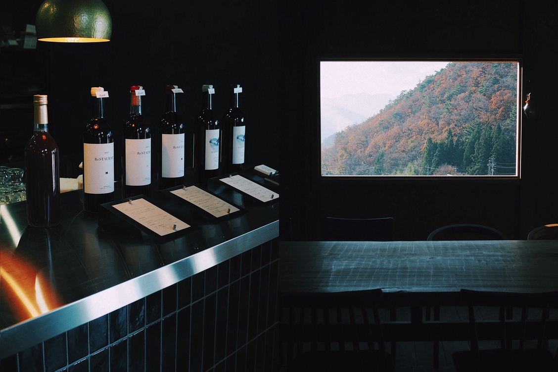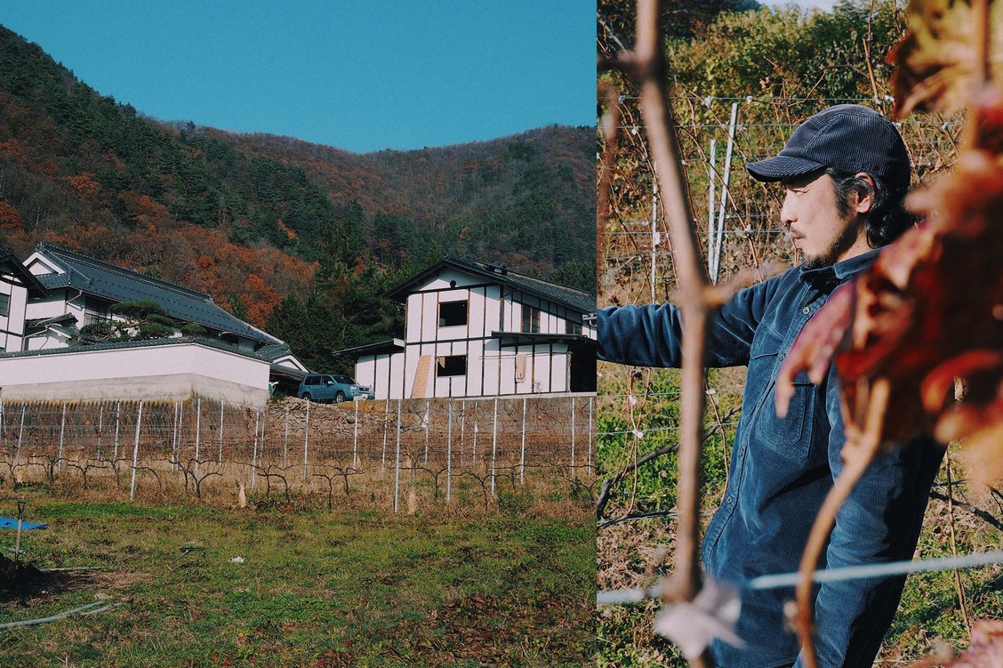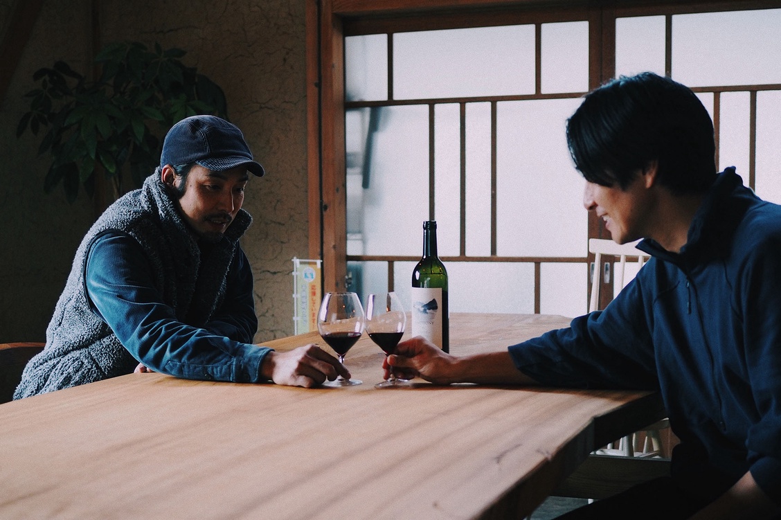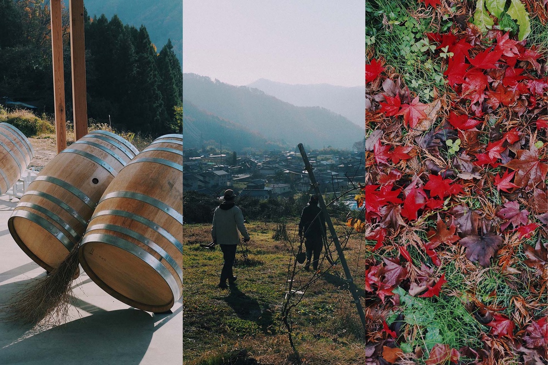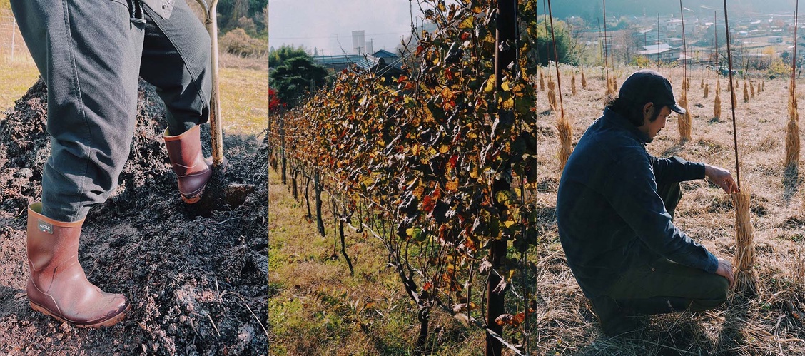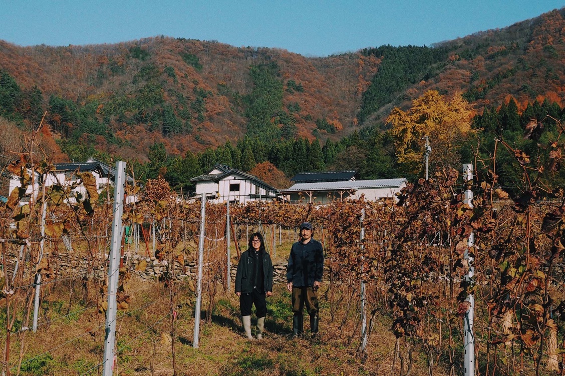 まだ雪は積もっていない、吹雪いてもいない晴れ間のある12月、車を走らせながら、千曲川の流れる千曲市に入る。そして“杏の里”の看板が立ち並ぶ倉科の街の小高い山の麓に広がる葡萄畑、その葡萄の丘を登った、丘のてっぺんにまだ真新しいワイナリー施設と、古民家を改装して作られた素敵なカフェが並んで顔を出しているのが見えてきた。地域の特性を活かし、地元の文化やコミュニティとの繋がりを大切に、自然と調和したワイン作りを実践している「の音wines」の依田夫妻にここまでの経緯やこれからのこと、いつものような雑談が始まった。笑
